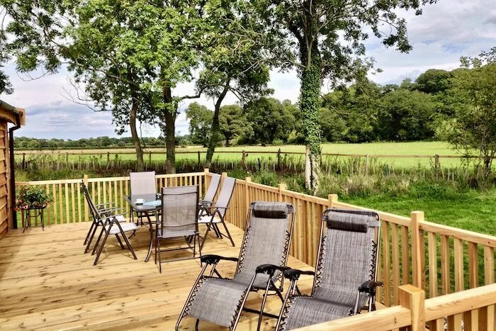 Our Lodges provide all you desire for a stylish, comfortable, and feature-rich accommodation experience! Each of our 4 Grand Luxury Lodges feature 3 bedrooms, 2 bathrooms, and ample living space, each of the four lodges can accommodate six people comfortably, boasting spacious living areas and a delightful outdoor space. The well-equipped open-plan kitchen features a large island and all standard full-size appliances. The living area offers ample seating with two large sofas facing a wide-screen smart TV and a log burner effect electric fire. There is ample room for dog beds as well should you wish to bring your furry companions. The dining section includes a large family table overlooking the terrace. Each lodge comprises three bedrooms, with the master double bedroom having an ensuite shower room, while the other two bedrooms share a family bathroom. All bedrooms include ample wardrobe space and smart TVs. Outside, the enclosed wooden decking provides a 6-seater dining table with recliner chairs.